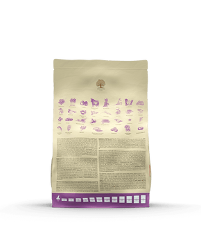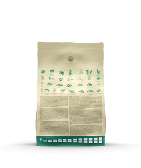 Прясно обезкостено пилешко и патешко месо, сушено пилешко и патешко месо, сладки картофи, картофи, грах, прясна сьомга и пъстърва, пресни цели яйца, ленено семе, кълнове от люцерна, черен дроб, грахови влакна, витамини и минерали, MOS, FOS, глюкозамин*, хондроитин*, MSM* (*всички от естествени източници), червени боровинки, акай бери, боровинки, черници, ябълки, домати, портокали, круши, моркови, спанак, карфиол, водорасли, невен, женшен, зелен чай, джинджифил.