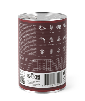 Прясно обезкостено пилешко и патешко месо, сушено пилешко и патешко месо, сладки картофи, картофи, грах, прясна сьомга и пъстърва, пресни цели яйца, ленено семе, черен дроб, кълнове от люцерна, пилешка мазнина, витамини и минерали, MOS, FOS, глюкозамин*, хондроитин*, MSM* (*всички от естествени източници), червени боровинки, акай бери, боровинки, черници, ябълки, домати, портокали, круши, моркови, спанак, карфиол, водорасли, невен, женшен, зелен чай, джинджифил.